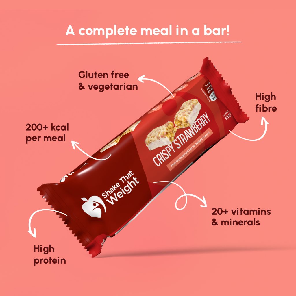 Our Crispy Strawberry Meal Bar is designed as a full meal replacement on any of our diet plans. You might be concerned that as a meal replacement it won’t fill you up, but don’t worry! It’s a larger size bar so is much more substantial than your average cereal or snack bar – it’s a little higher in calories, too, but that just helps to keep those cravings at bay between meals.