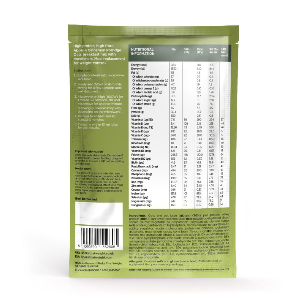 Start your day off right with our Apple Cinnamon Flavoured Porridge. Our hearty porridge will set you up for the day, and at only 200 calories per bowl, you can enjoy your breakfast guilt-free – and it tastes so good, you might decide to have it for lunch and dinner as well! It’s packed full of good stuff like protein and fibre that can keep you fuller for longer and fight those annoying cravings, as well as loads of other essential vitamins and minerals. Quick and easy to make in just a few minutes, this porridge can be used as a meal replacement on any of our diet plans.