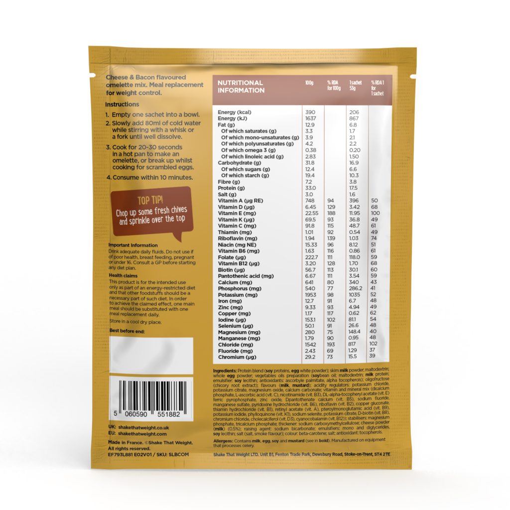 Suitable as a meal replacement on any of our diet plans, our Cheese and Bacon Flavoured Omelette is just 206 calories but still contains all the healthy stuff you need when losing weight. It’s packed full of protein and fibre to help keep you fuller for longer, as well as at least 30% of your RDA of vitamins and minerals.