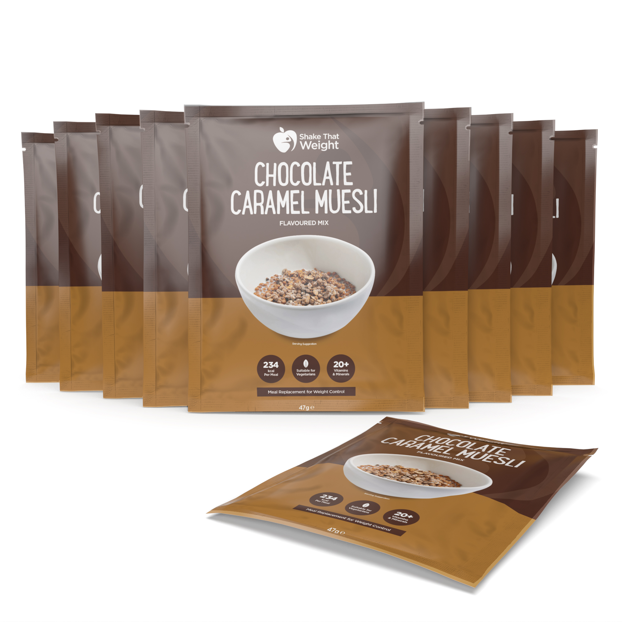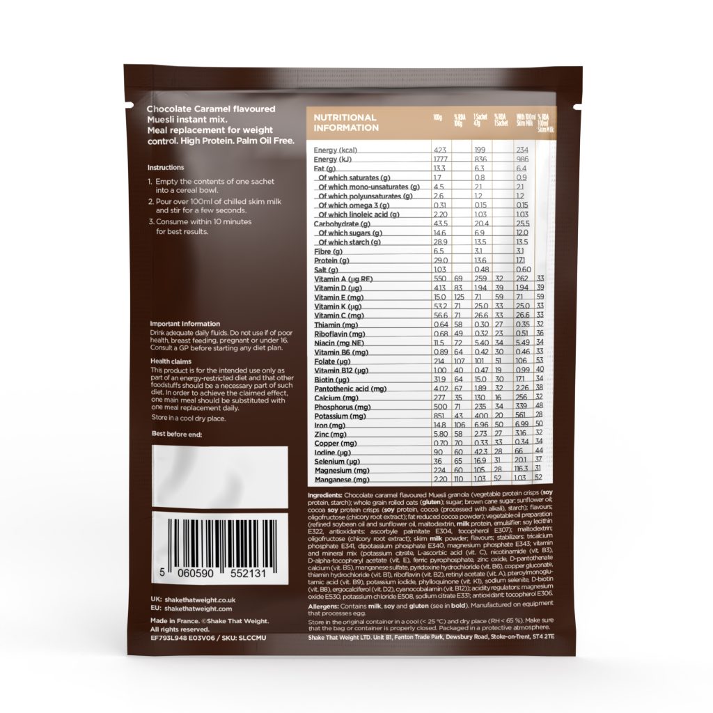 Indulge in our delicious Chocolate Caramel Muesli, perfectly designed to satisfy your cravings while supporting your weight-loss journey. Each sachet counts as one nutritious meal, packed with over 20 vitamins & minerals. With 17.4g of protein and high in fibre, it keeps you full and satisfied without sacrificing flavour.
