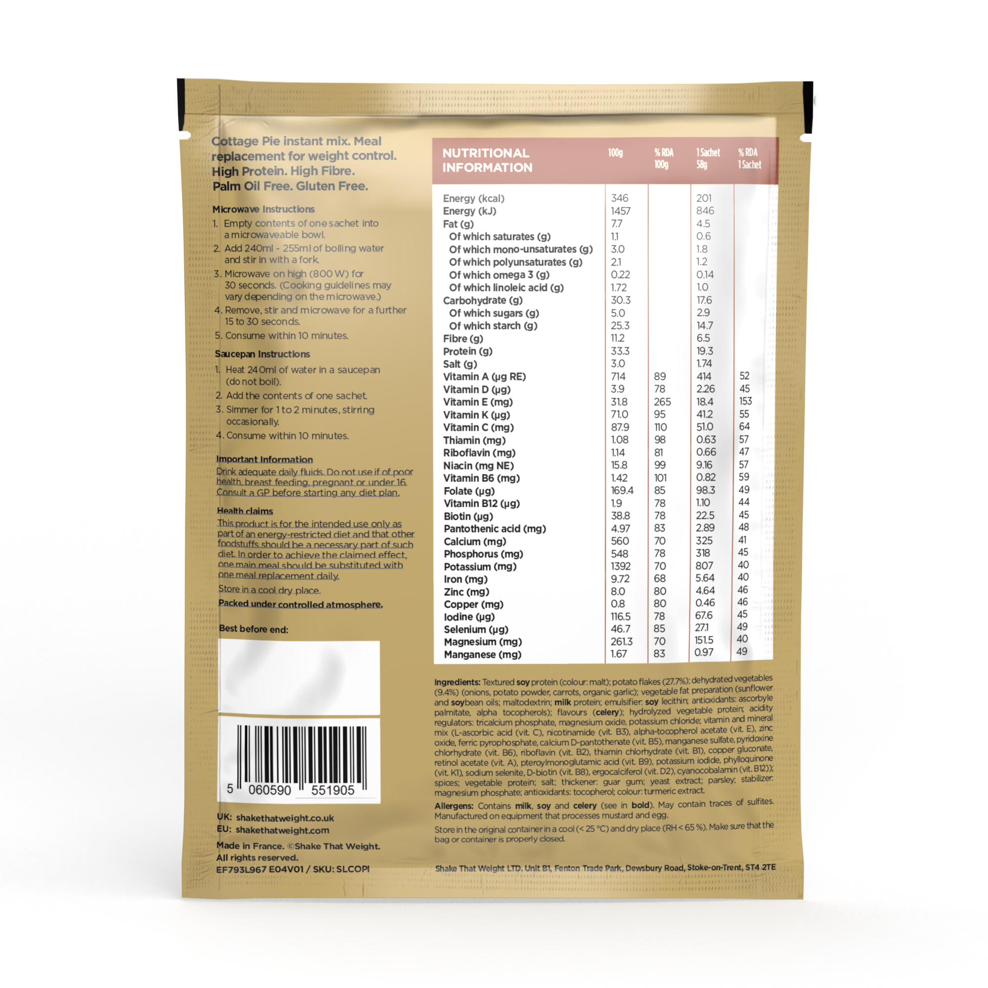 As well as tasting almost as good as a cottage pie you’ve slaved over in the kitchen for hours, our meal replacement cottage pie is also specially formulated to be packed full of all the good stuff your body needs when losing weight quickly. It contains more than 20 essential vitamins, minerals and nutrients, including being high in protein and fibre – this also helps keep you fuller for longer and fend off those pesky cravings between meals.