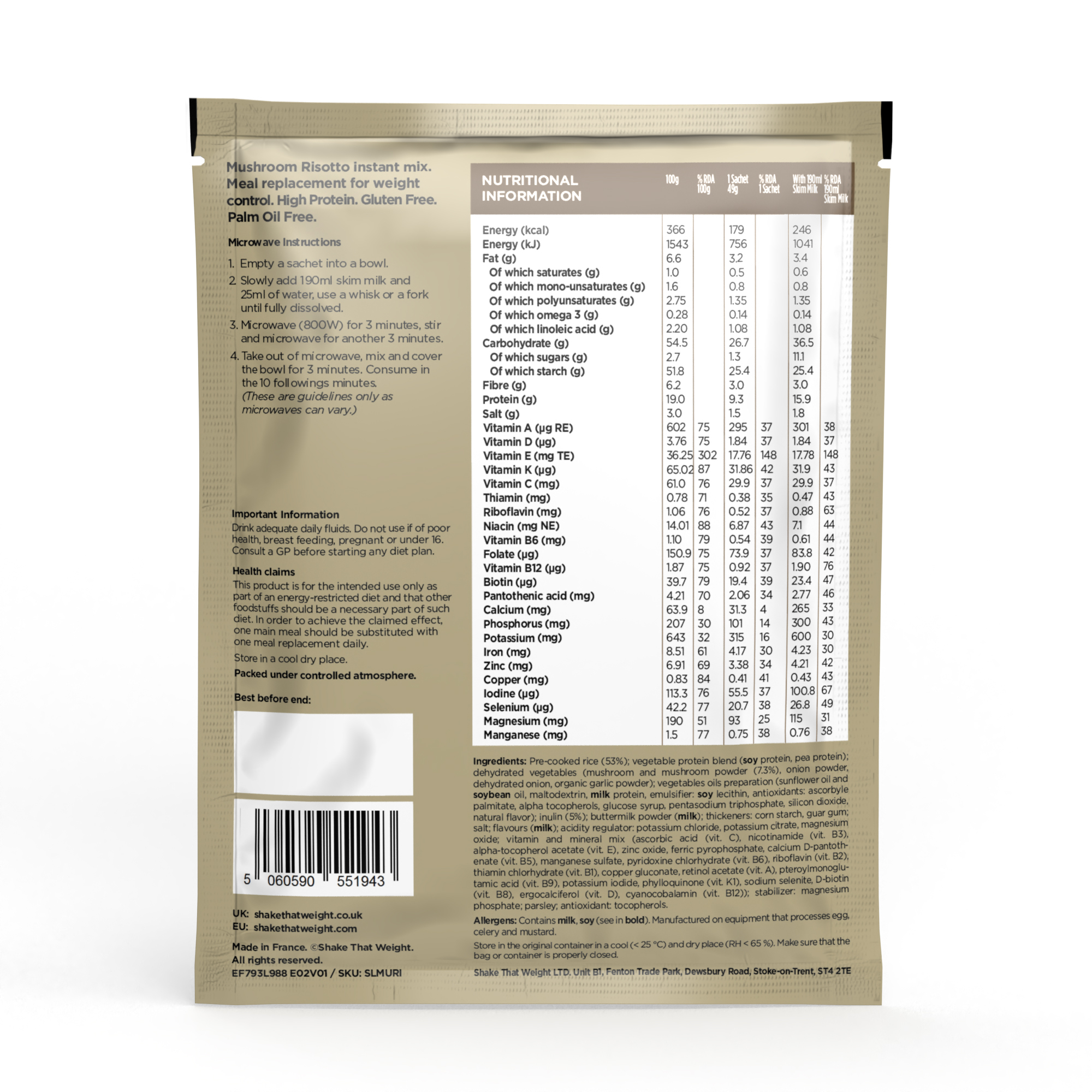 Suitable as a meal replacement on any of our diet plans, our creamy mushroom risotto makes for an ideal lunch or dinner. Plus each serving contains at least 25% of your RDA of the essential vitamins and minerals you need when losing weight on a very low calorie diet. Add our mushroom risotto to your diet plan today.
